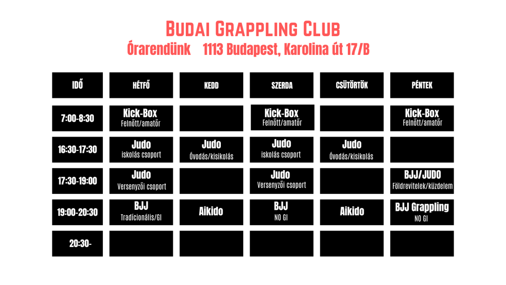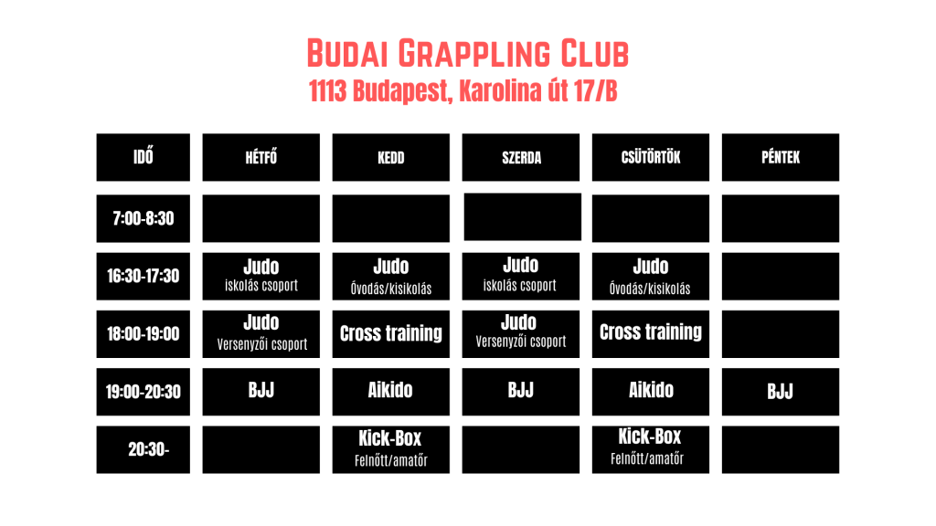 A Budai Grappling Club a XI. és a XII. kerület határán vár mindenkit, aki szeretne sportolni és jól érezni magát. Edzéseinken a judo és a brazil jiu-jitsu alapjait és haladó technikáit tanulhatod meg, mindezt egy barátságos, támogató közösségben. Itt nemcsak fejlődni és erősödni tudsz, hanem új barátokra is lelhetsz, miközben valódi küzdősport-élményt kapsz.